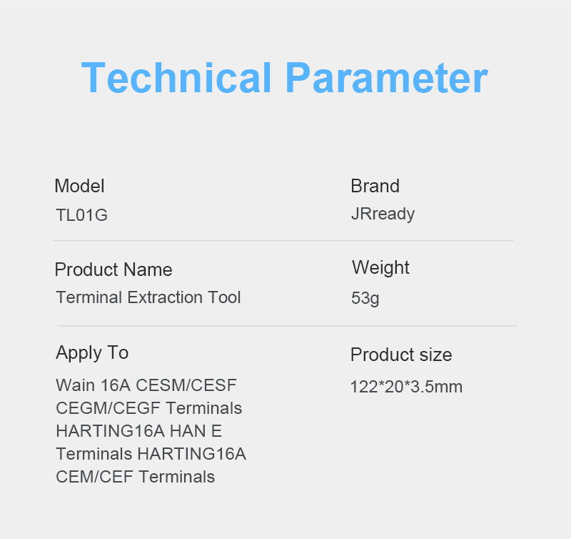 Application: Designed for removing HARTING Han E, Han EE, Wain HAC, HEC, HM, HK, HQ series, and TE 16A round contacts safely and efficiently.