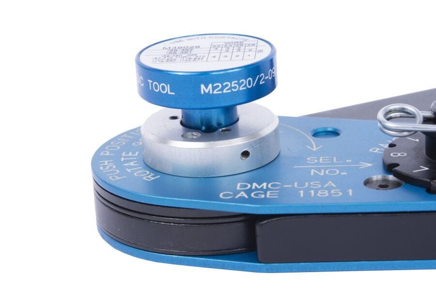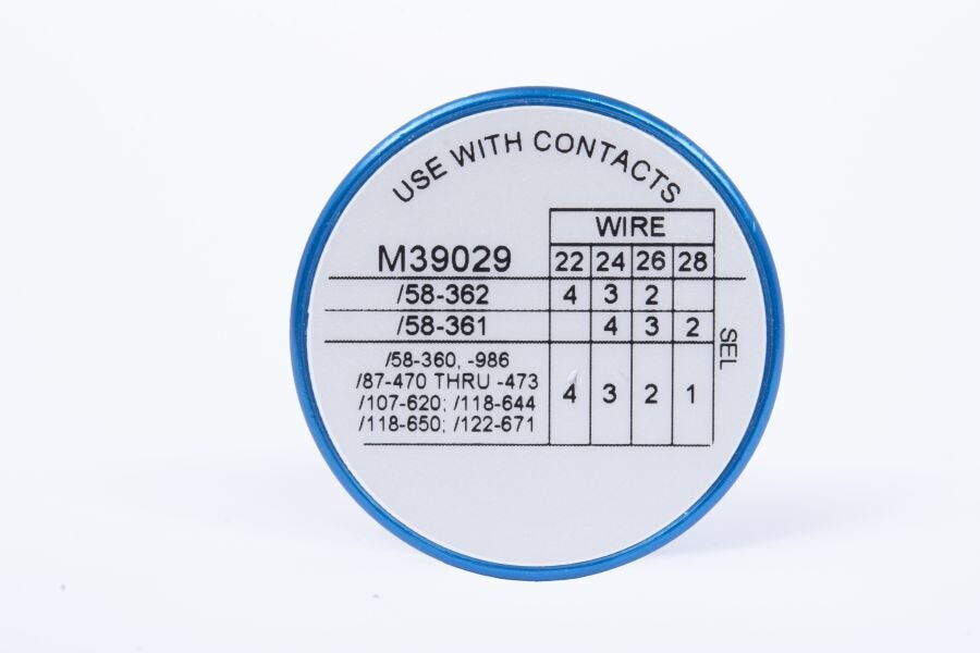 This positioner is used with the M22520/2-01, AFM8® tool frame and adapts the tool frame to a particular application. The data plate on each positioner designates which contacts the positioner accommodates for its wire size and indicates selector position.